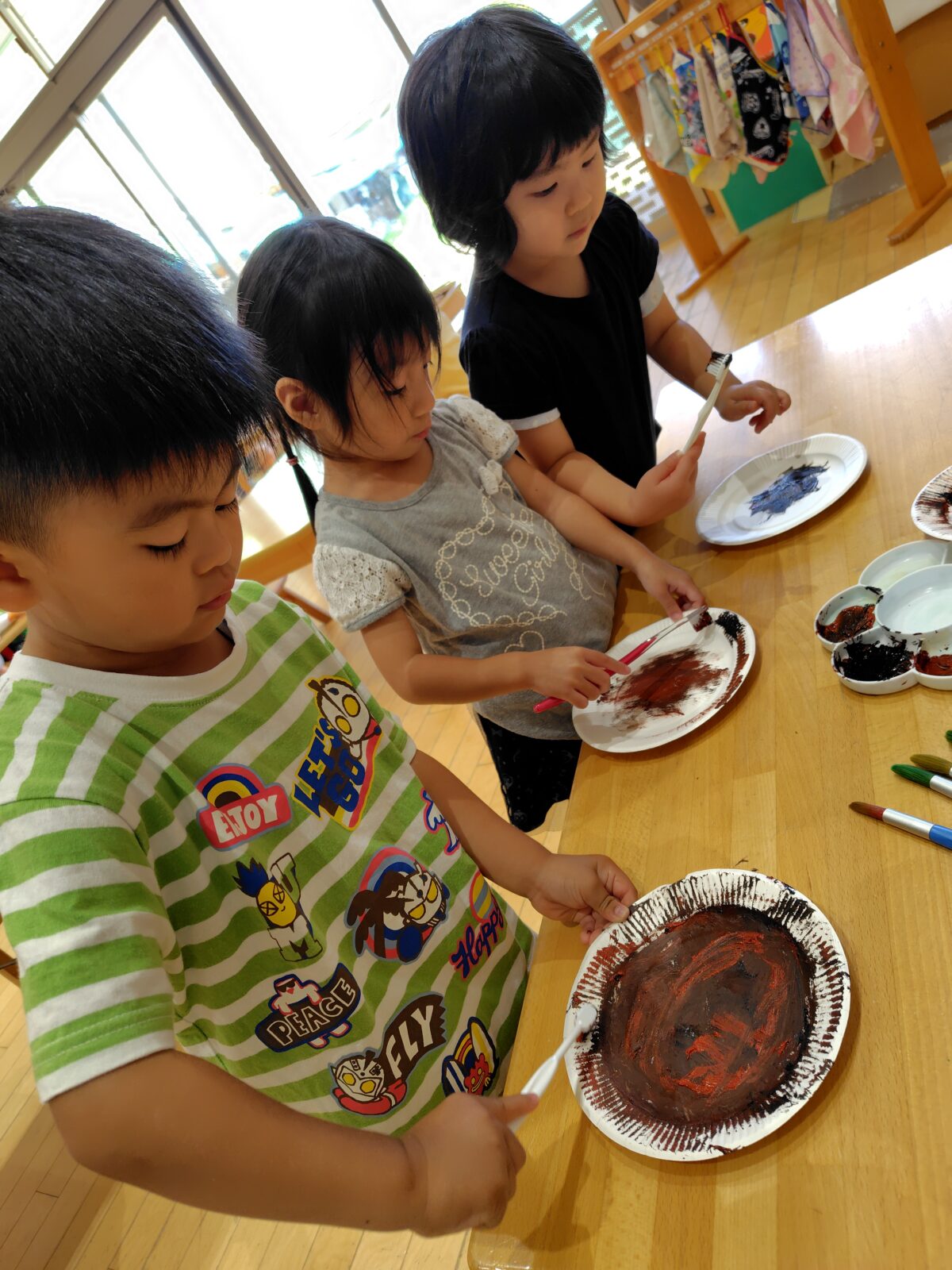 栗のイガは、歯ブラシに絵の具を付けて紙皿に塗り、イガイガを表現しました。
