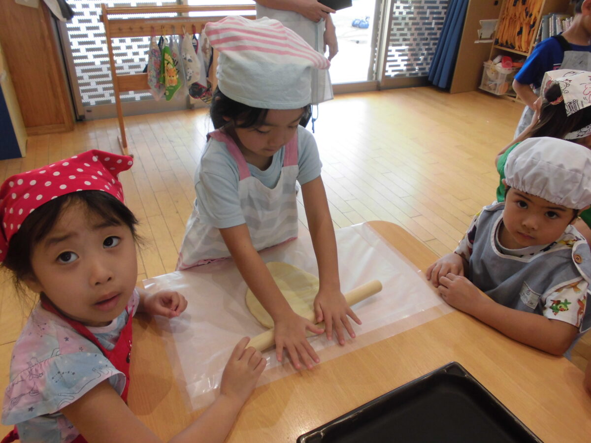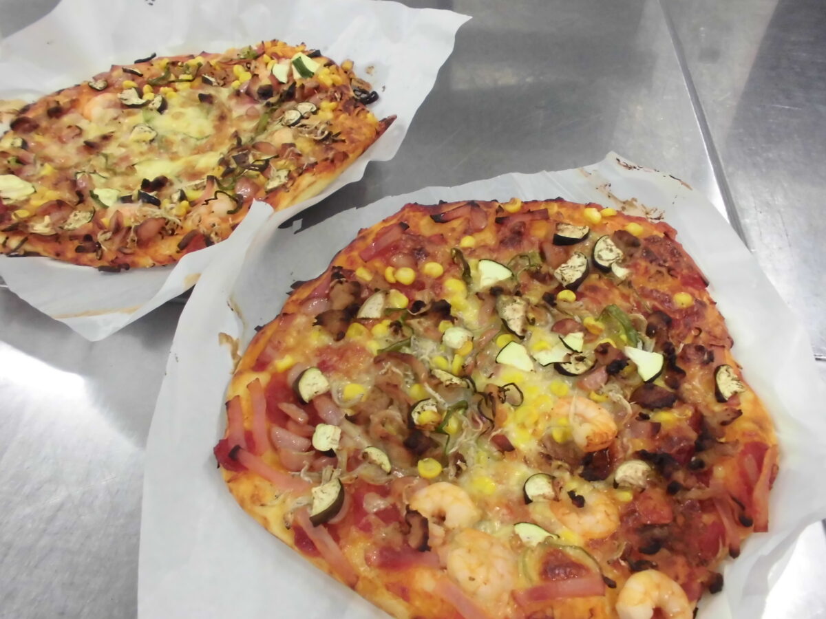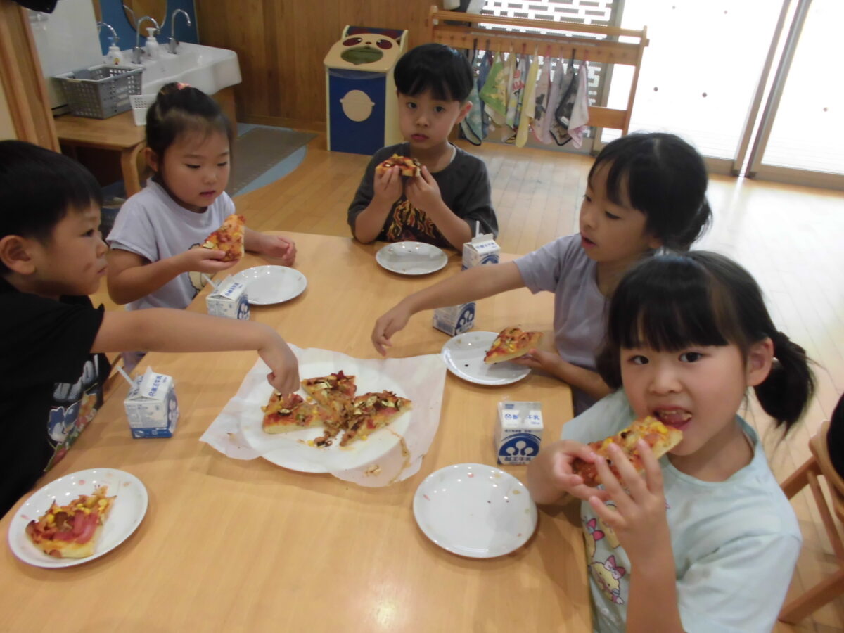 栄養満点のピザをおやつ時間にみんなで喜んで食べました。