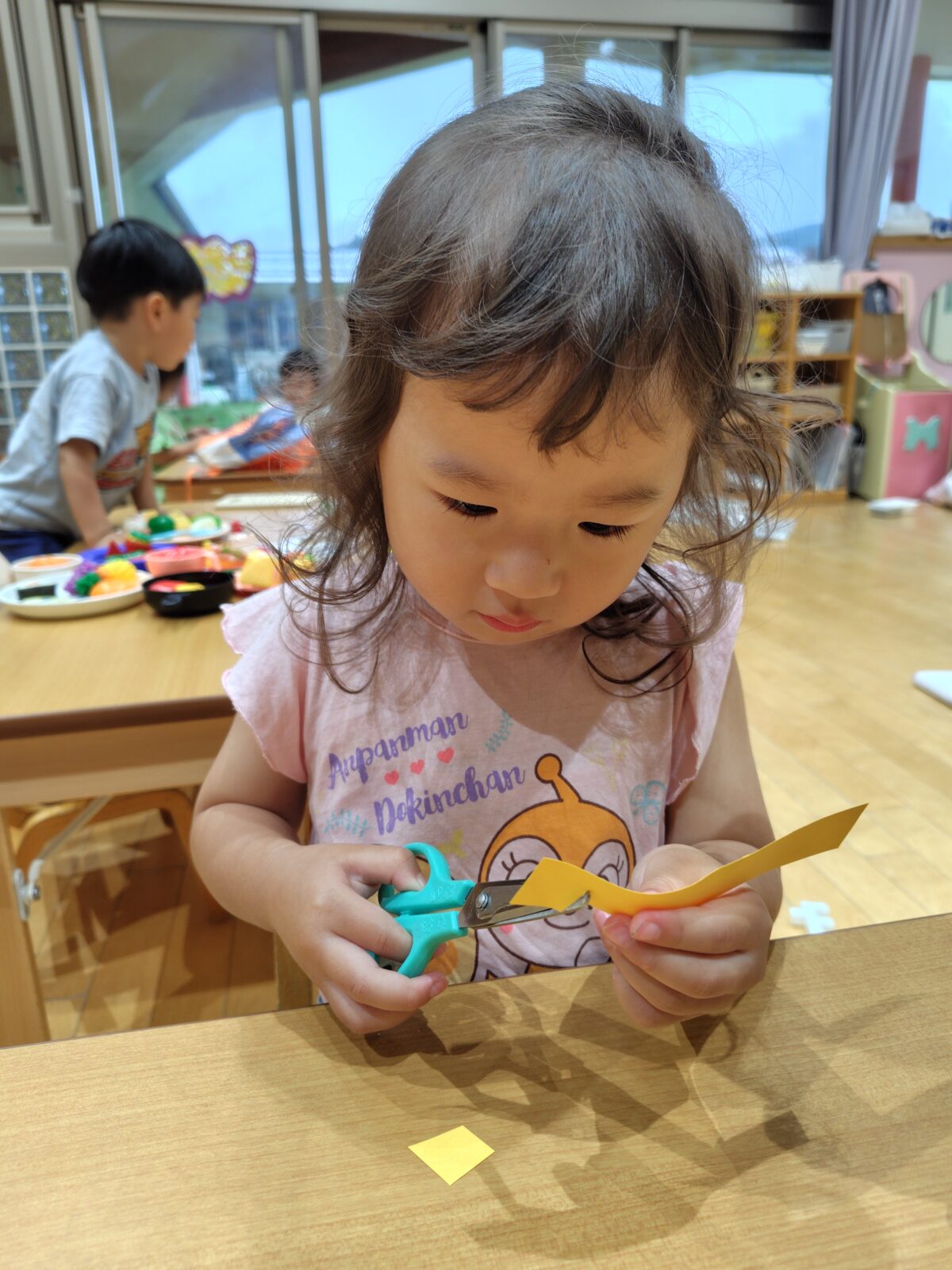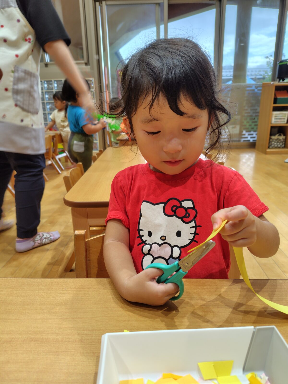 ハロウィンの製作では、ハサミを使って画用紙を細かく切ることに挑戦。