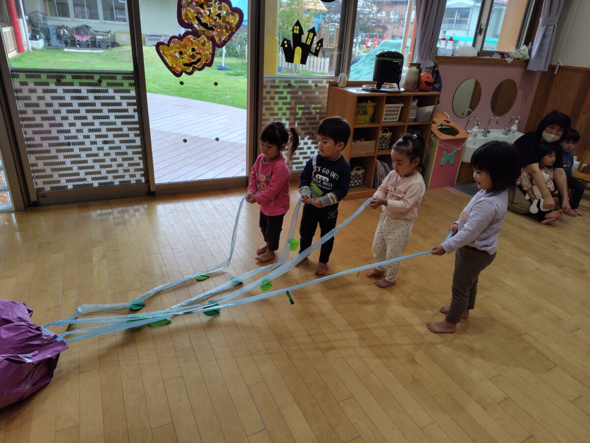 部屋の窓に飾ると「こわーい」「かわいい」と子ども達は喜んでいました。