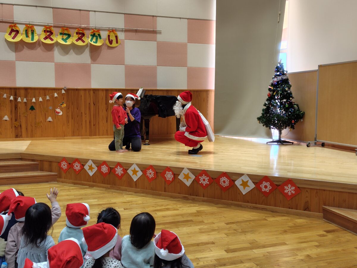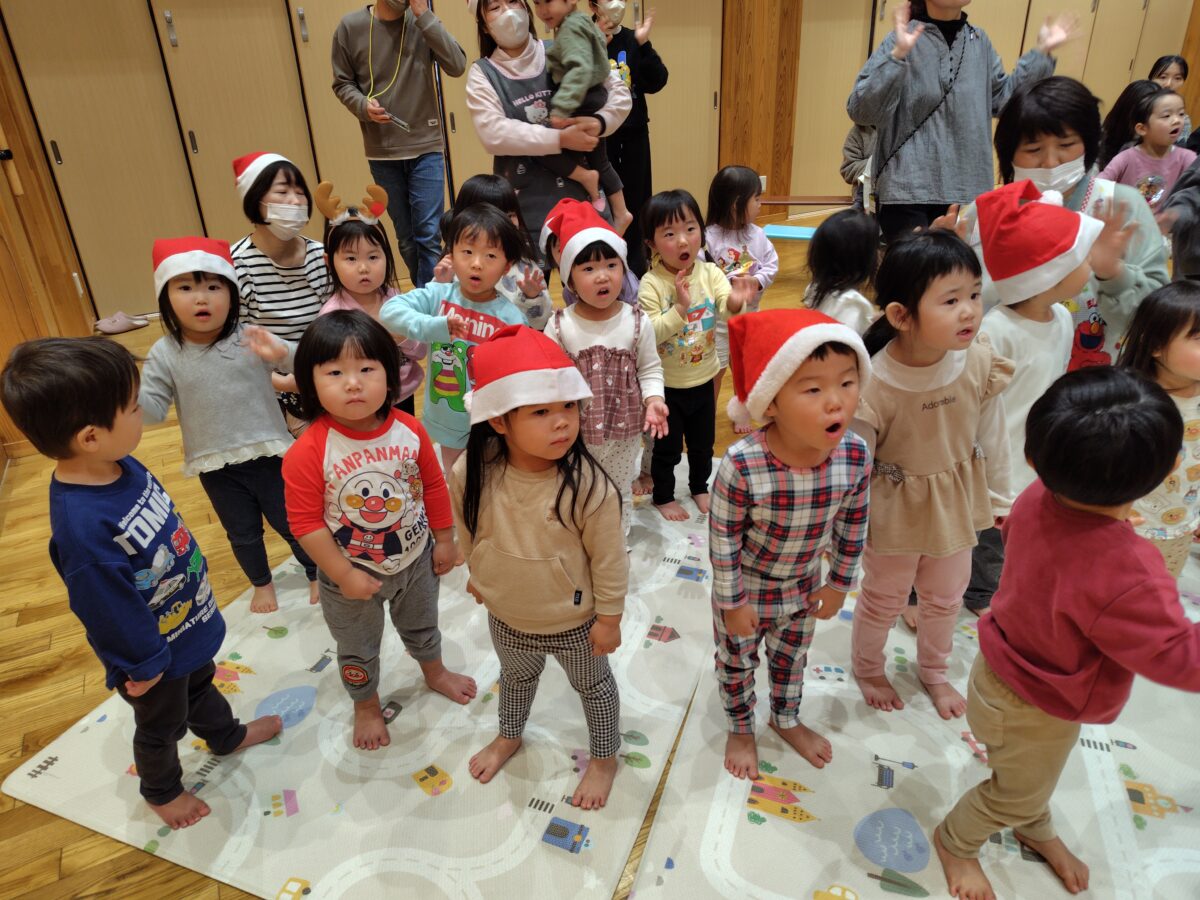 いよいよサンタさんの登場!!歓声を上げて喜ぶ子、じーっとサンタさんを見つめる子…と、それぞれでした。