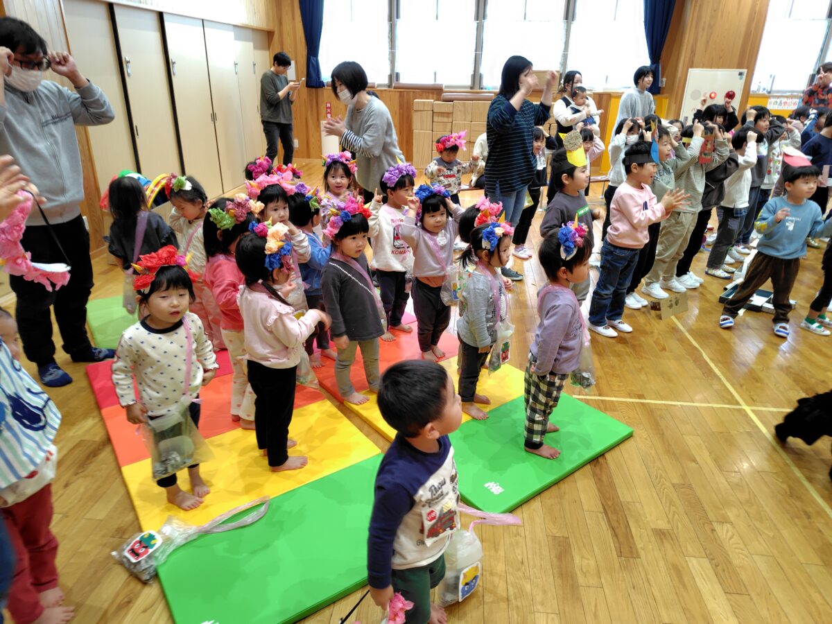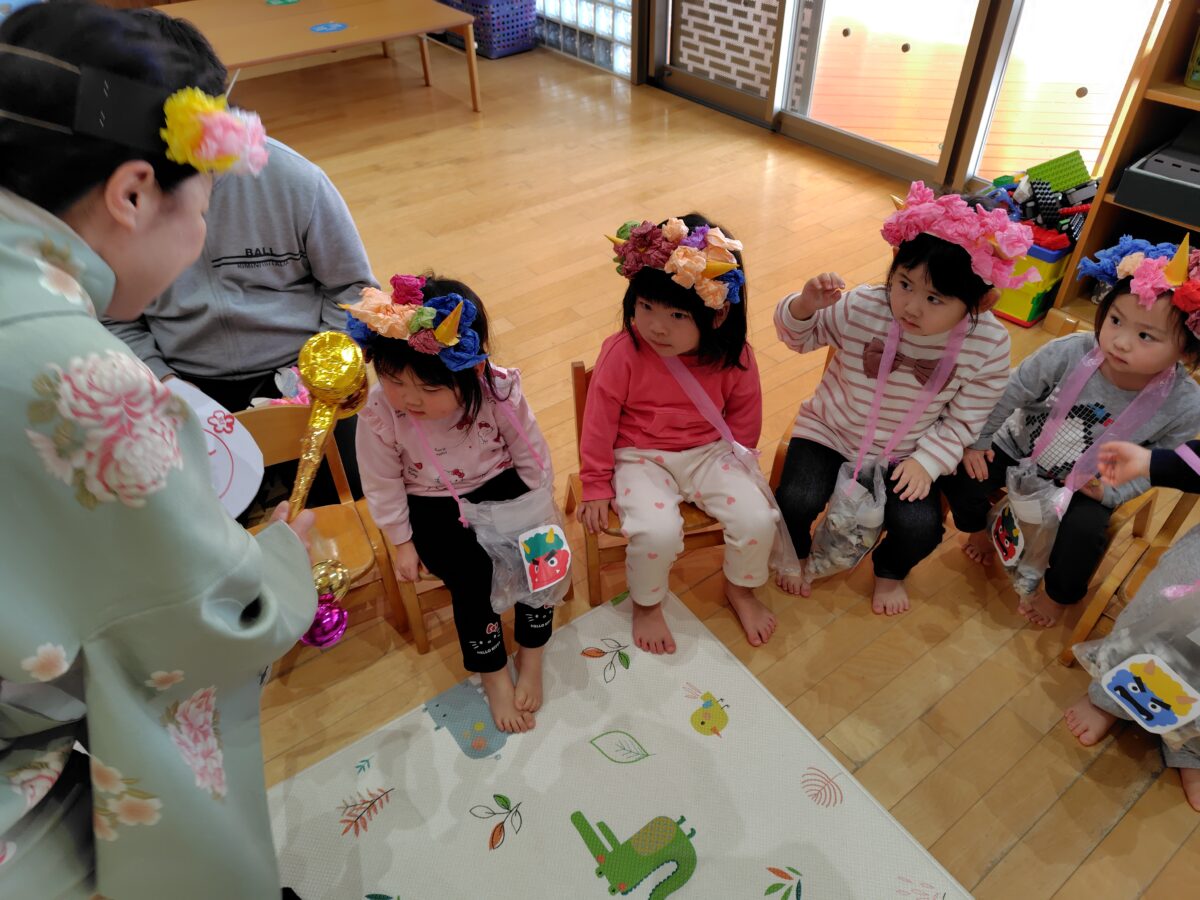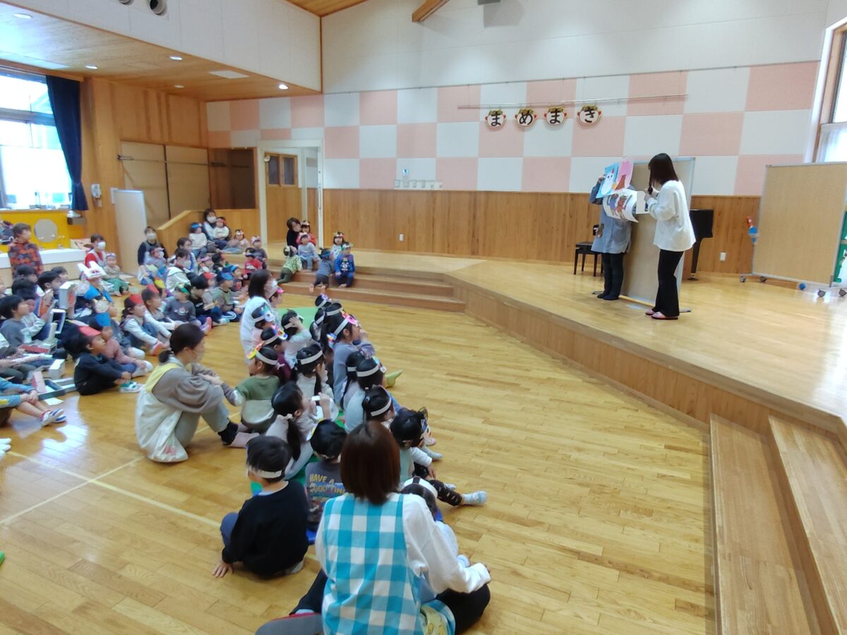 自分で作った鬼のお面を被ってホールの集まった子ども達。節分の由来や豆まきについての話を聞いた後、豆まきの歌と鬼のパンツの歌をみんなで歌いました。子ども達の元気な歌声が園内いっぱいに響いていました♪