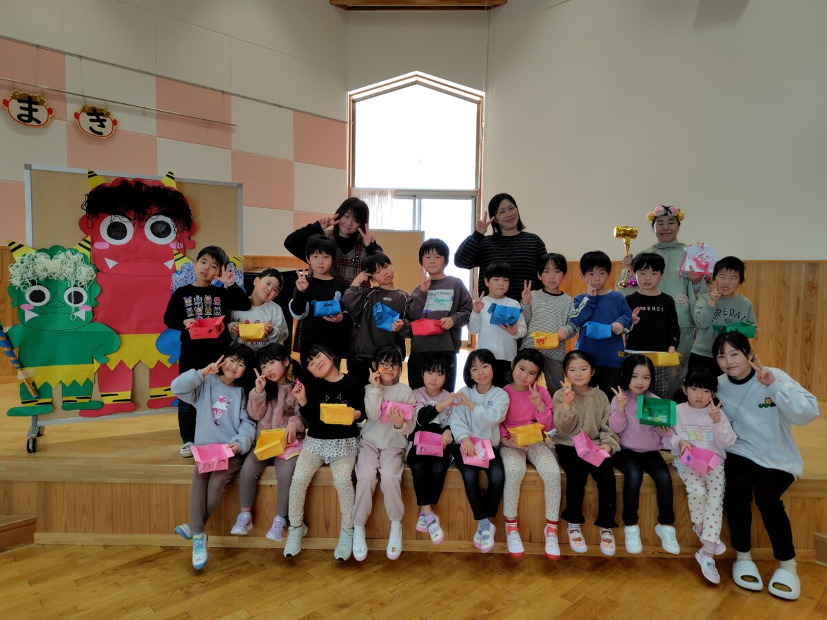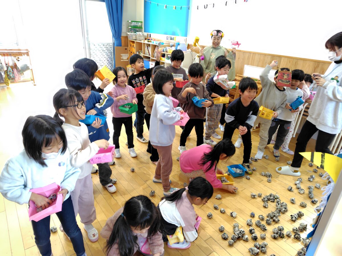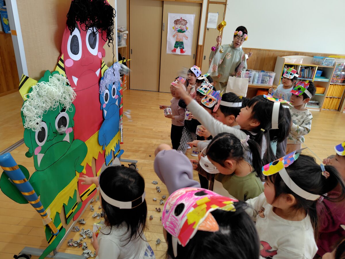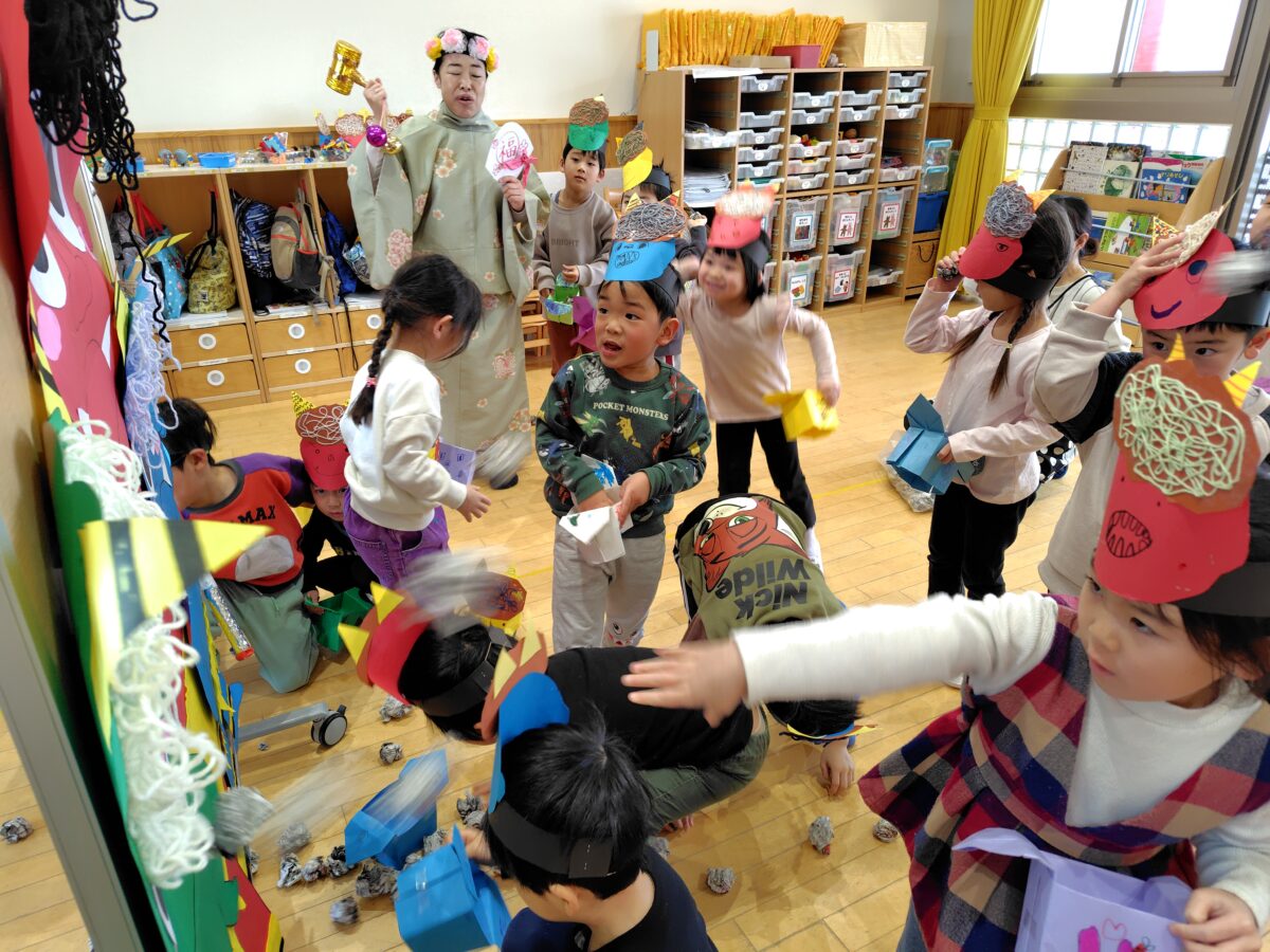 集会が終わると、各クラスに鬼が登場!「おにはそとー!ふくはうちー!」と鬼に向かって豆を力いっぱい投げていました。