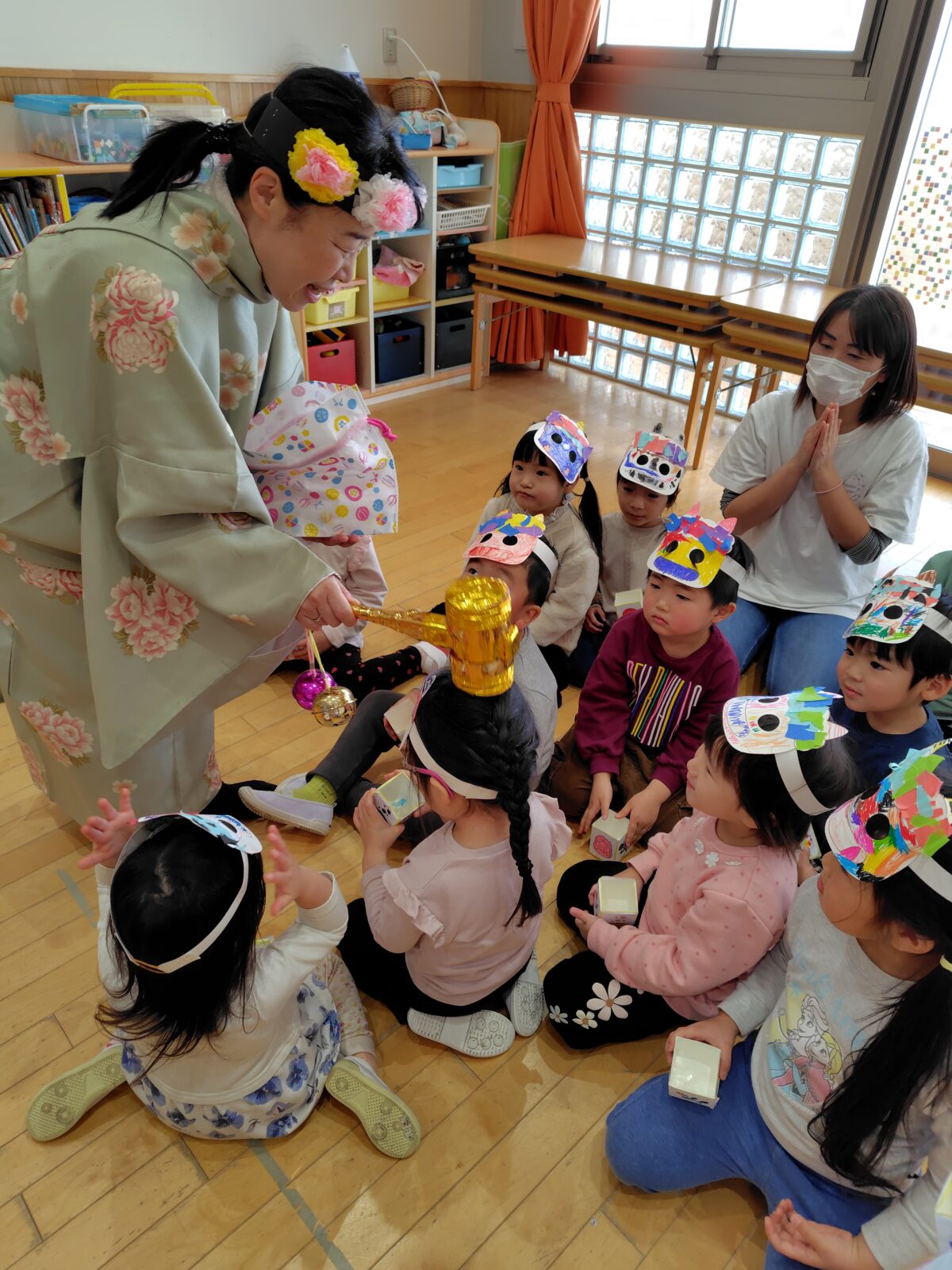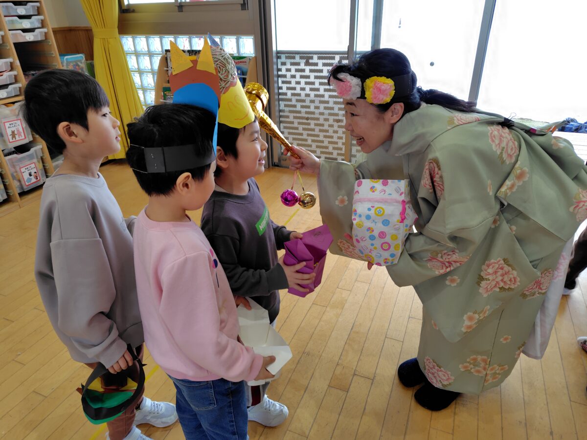 鬼をやっつけると、幸せを運ぶ福の神が登場し、「幸せのラムネ」をいただきました。金の小槌で頭も撫でてもらいました♪
