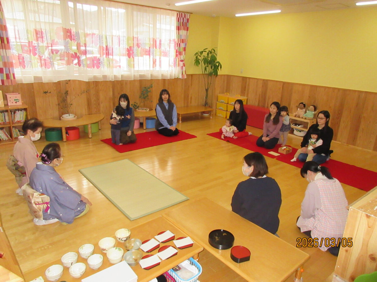 活動日記 DIARY 活動日記 3月 子育て支援 わんぱくランド 2026年4月10日 お別れお茶会 3月5日(木)お別れお茶会がありました。1年間の感謝を込めてお茶の先生がたててくださったお茶を保護者の方にふるまいました。子育てが忙しいお母さん方の癒しの時間になれたのではないかと感じます。 自由来園 3月も自由来園にたくさんのお友達が来てくれました。好きな遊びを十分に楽しんでいました。来年度も、自由来園日があります。一緒に遊びませんか?お待ちしていますね。 新しい記事へ古い記事へ 活動日記一覧に戻る